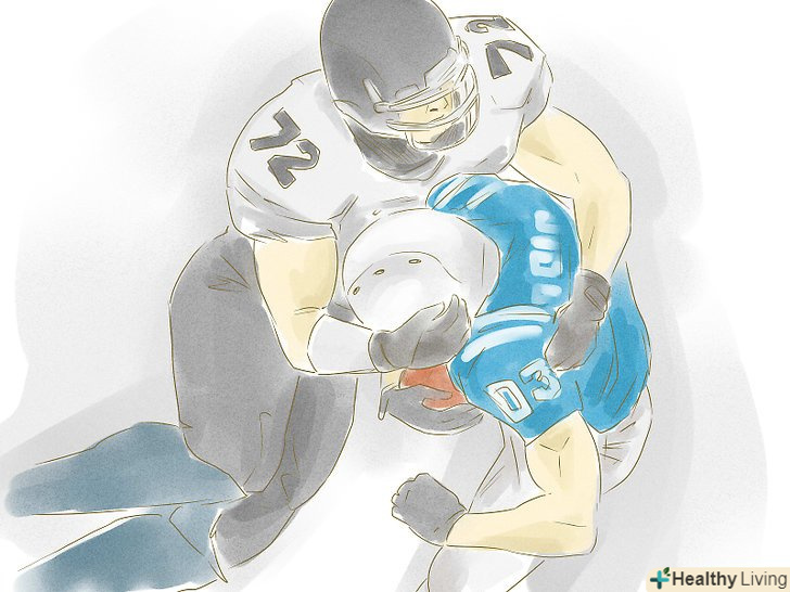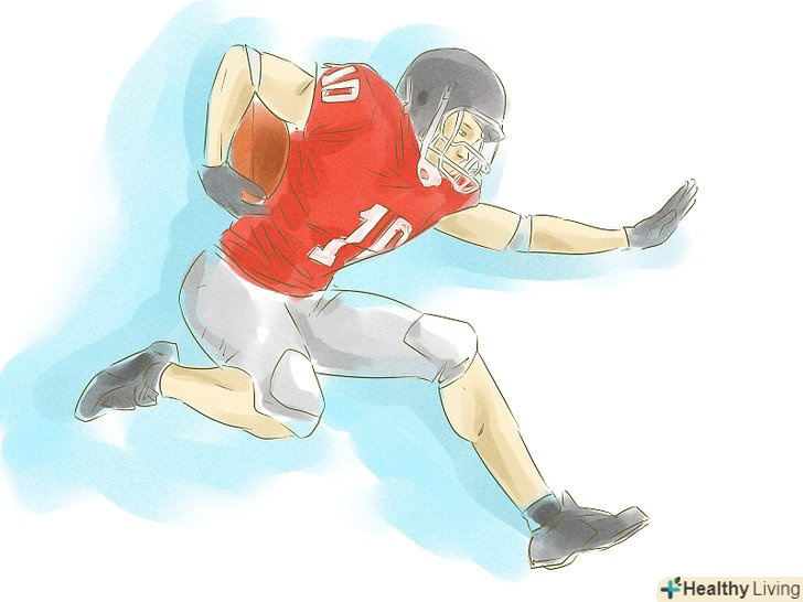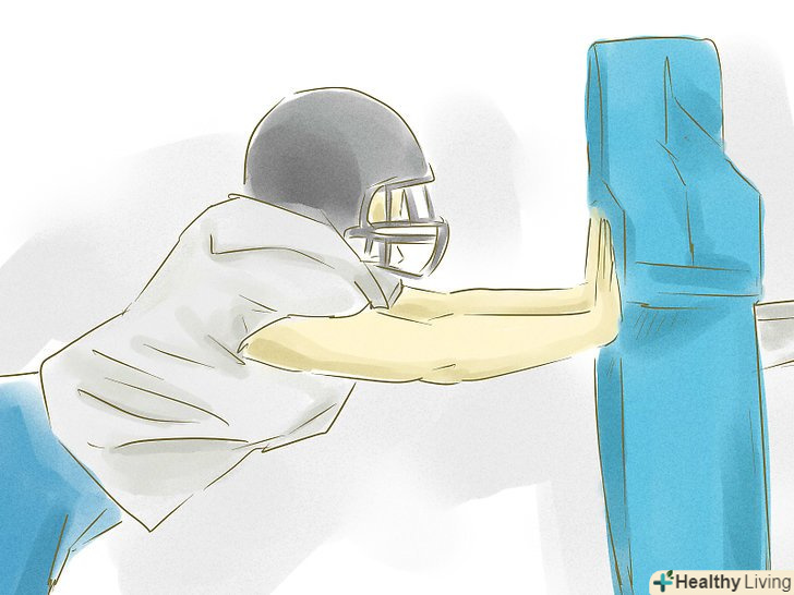 - Грайте в американський футбол із зігнутими колінами. Потрібно, щоб суглоби були зігнуті для використання м'язової сили тіла. Випрямлені коліна і стегна підвищують ризик травмування і неефективні. Сконцентруйте своє тренування на розвитку потужних і швидких ніг. Дійдіть до такої фізичної форми, коли ви зможете 10 разів присісти з подвійною вагою Вашого тіла; якщо ви можете це, то у вас дуже сильні ноги для вашої ваги, і ваша здатність розігрувати м'яч стане значно краще.