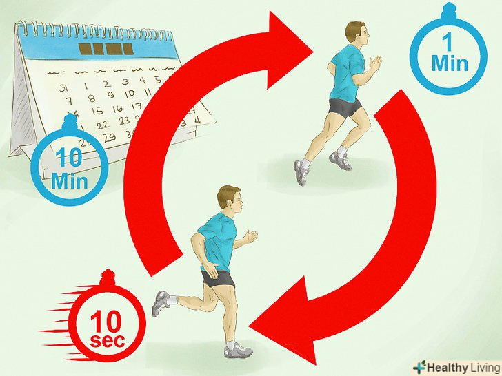 Бігайте за спеціальним графіком, що розвиває швидкість і витривалість. бігайте по пагорбах 2-3 рази на тиждень, щоб стати сильніше і швидше. Спробуйте бігати по ось такому графіку:- День 1: 10–20–10. Біг підтюпцем 10 хвилин, швидкий біг 20 хвилин, біг підтюпцем 10 хвилин.