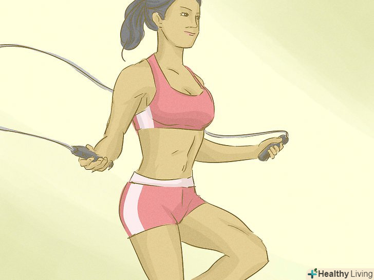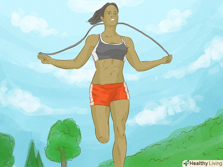 Стрибайте зі скакалкою. стрибки зі скакалкою допомагають зміцнити м'язи і збільшити швидкість [2] .- Почніть C стрибків на обох ногах. Станьте, тримаючи скакалку за спиною, потім змахніть нею, щоб вона пролетіла над вами, а потім вниз, і злегка підстрибніть. Немає необхідності стрибати занадто високо, достатньо лише перестрибнути скакалку. Продовжуйте стрибки, збільшуючи швидкість до тих пір, поки не підберете відповідний темп. Ця вправа розвиває витривалість [3] .