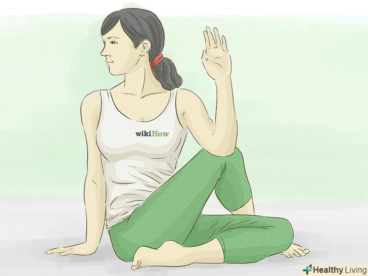 - Другу ногу занесіть над першою, притиснувши п'яту до стегна нижньої ноги. Таким чином, обидві п'яти повинні стосуватися стегна іншої ноги, і одне коліно розташовуватися над іншим. Ця поза сприяє розтяжці м'язів ніг, підвищуючи їх гнучкість [12] .