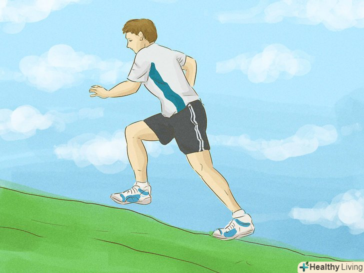 Підвищіть навантаження, займаючись інтервальним тренуванням на похилій місцевості. біг в гору дозволить вам тримати себе в хорошій формі. При такому бігу необхідно вище піднімати коліна і ступні, а також інтенсивніше рухати руками. Долаючи силу земного тяжіння, ви ефективно зміцнюєте свої м'язи [20] .- Виберіть дорогу або стежку з невеликим нахилом в гору. Врахуйте, що після забігу вгору ви повинні ще зберегти сили для повернення назад [21] .