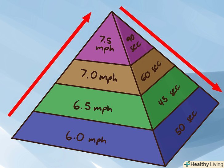 Використовуйте інтервальну тренування типу піраміди. починайте з коротких і інтенсивних прискорень і потім нарощуйте навантаження так, щоб найдовший період високоінтенсивної роботи припадав на середину тренування. Потім поступово повертайтеся до більш коротких прискорень і завершуйте тренування затримкою. Це більш складно, ніж постійні інтервали, і можливо для точного відліку часу вам варто скористатися секундоміром.- Розігрівайтеся протягом десяти п'ятнадцяти хвилин. Як описано вище, почніть з ходіння швидким кроком, перейдіть на легкий біг і нарощуйте швидкість до кінця тренування так, щоб в кінці розминки бігти з найбільшою інтенсивністю.