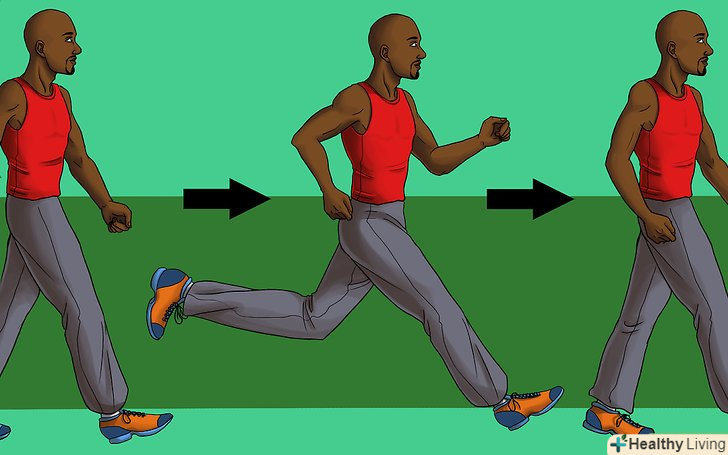 Робіть тренування з постійними інтервалами. це найлегший спосіб звикнути до інтервальних тренувань. Просто чергуйте періоди високо - і низькоінтенсивного бігу.- Почніть з п'ятнадцятихвилинного розігріву. Для початку підіть швидко і перейдіть на біг підтюпцем, набирайте швидкість і до кінця розігріву біжіть на весь дух. Це гарантує правильний розігрів перш ніж ви приступите до інтенсивної роботи на швидкість