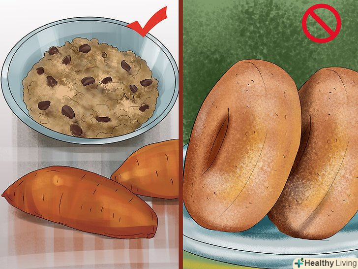 З'їжте побільше вуглеводів. за пару годин до бігу дайте своєму організму потрібне йому паливо. Вуглеводи-це ідеальне паливо для бігунів на великі дистанції. Правильно вибрані вуглеводи будуть перероблятися організмом повільно і поступово, що дасть вам достатньо енергії для забігу. Можна додати трохи жирів в їжу перед забігом (наприклад, оливкова або арахісове масло), а ось багаті білком продукти на зразок стейка або тофу краще залишити на потім.- Найкраще їсти складні вуглеводи, тобто ті, які дадуть вам енергію і не викличуть відчуття голоду через півгодини. Їжте цільнозернові продукти (хліб з цільнозернового борошна, вівсянку, бурий рис), коренеплоди (наприклад, батат), а також бобові (горох, сочевицю). [13]