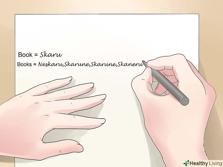 Придумайте утворення множини іменників. потрібно, щоб мова давала чітку відмінність між "книгою" і "книгами". У багатьох мовах для цього просто додається суфікс-S. можна використовувати не тільки суфікси, а й префікси. Можна навіть додавати ціле слово! (приклади: якщо книга = Skaru, то книги можуть бути Neskaru, Skarune, Skaneru, Skaru Ne або Ne Skaru і т. д.)