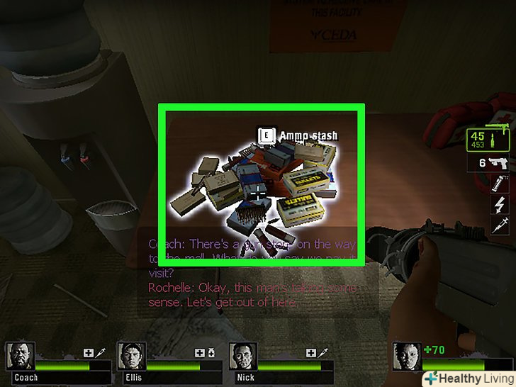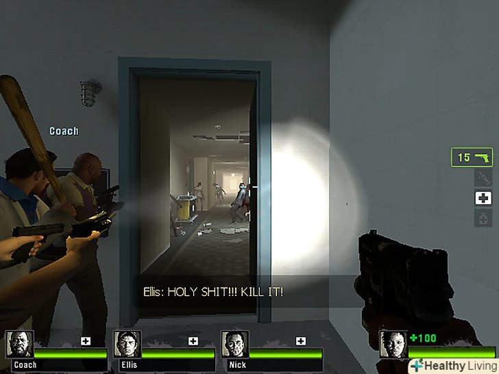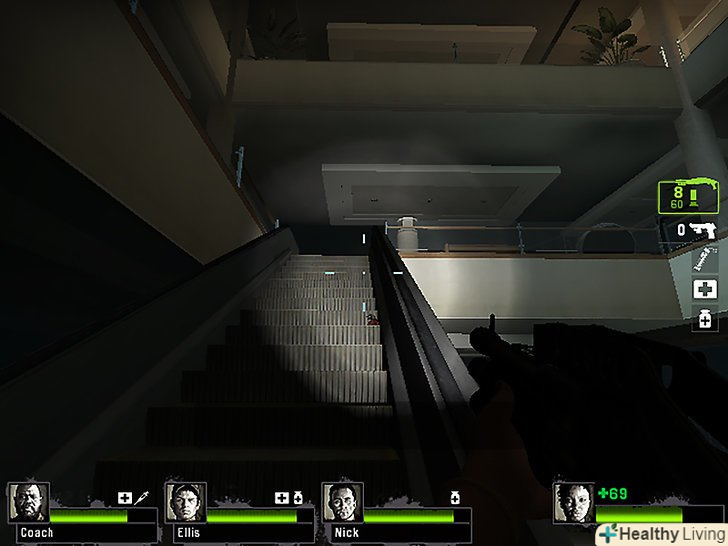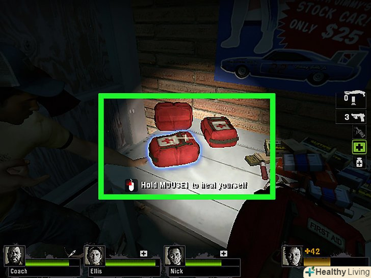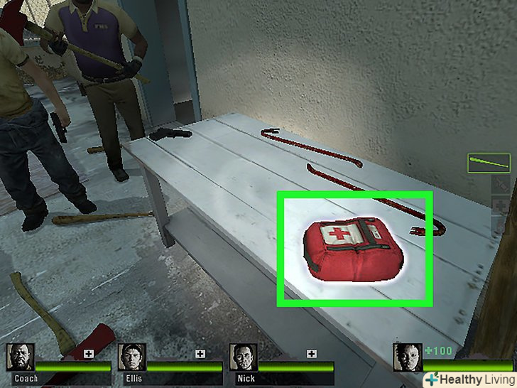 Не використовуйте аптечки, якщо тільки це не є на 100% виправданим (наприклад, коли хтось знаходиться на межі життя і смерті). Аптечки-це дуже цінний предмет, цінуйте їх. Коли Вам завдадуть достатньо шкоди, щоб використовувати аптечку, то все стане сірим, а ваша швидкість зменшиться. Ось тоді і лікуєтеся з аптечки. До тих пір-сидіть на болезаспокійливих і шприцах з адреналіном.- Втім, якщо ось-ось почнеться крещендо, а у вас менше 40 одиниць здоров'я, то можете використовувати аптечку. [8]