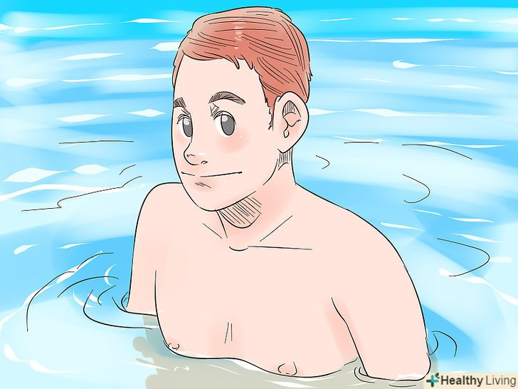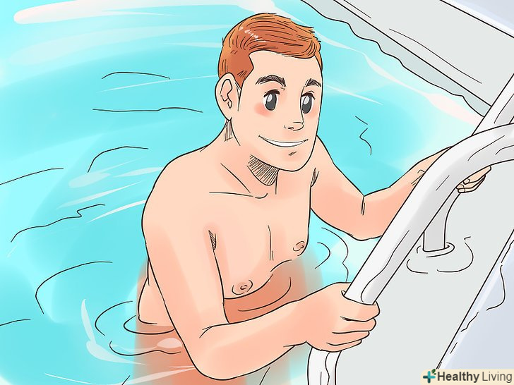 Поступово входите в воду. якщо в басейні є сходи, можна потихеньку спускатися по цих сходах вниз, затримуючись на кожній сходинці стільки, скільки буде потрібно, щоб відчути себе комфортно. Після того як встанете на дно басейну, зупиніться, глибоко вдихніть і розслабтеся. [8]