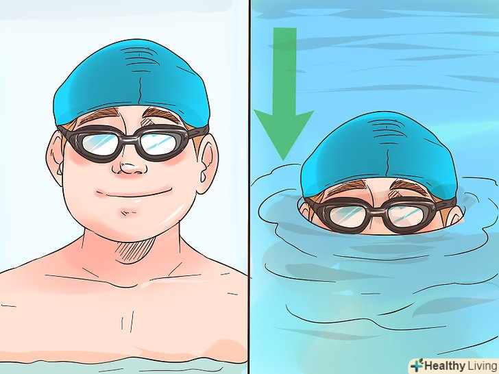 Спробуйте занурити у воду обличчя. це одна з найбільших труднощів для початківців плавців – пересилити свій страх і занурити у воду голову. Почніть з легких бризок - трохи намочіть обличчя, ніби ви вмиваєтеся. Як тільки будете готові, зробіть глибокий вдих, потім присядьте в воді, щоб все обличчя занурилося в воду. Продовжуйте повторювати цю вправу, з кожним разом занурюючись все глибше, поки вся голова не буде перебувати під водою. [9]