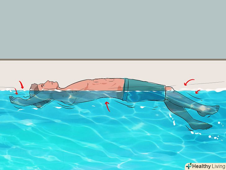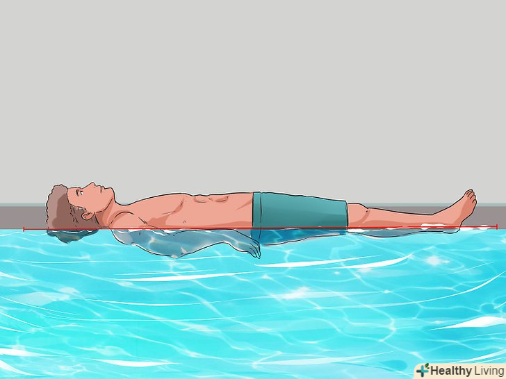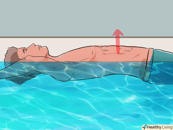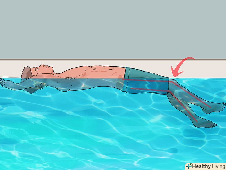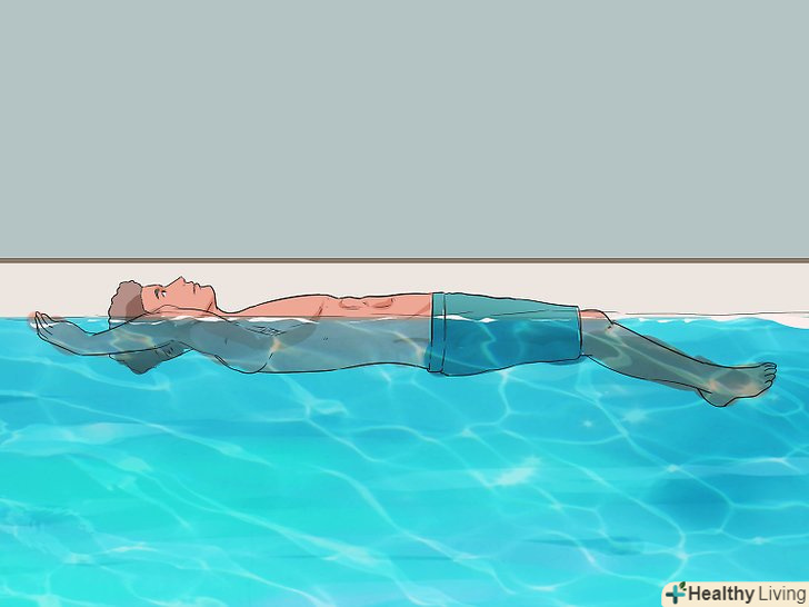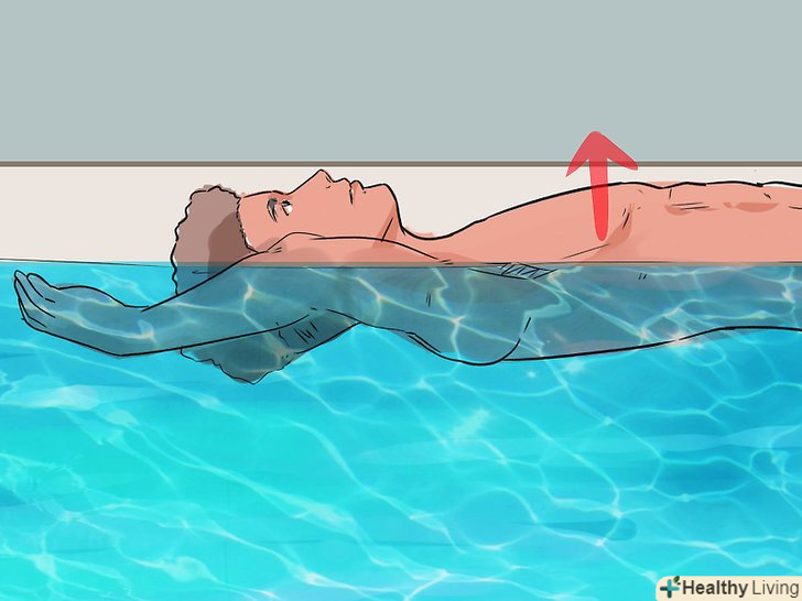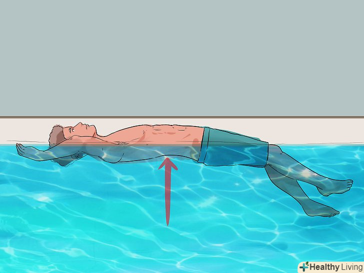 Тримайте ваше тіло на рівні води. Перед тим як почати плавати на спині самостійно, ви повинні розташувати своє тіло на рівні води – в ідеалі, ви повинні почати з положення тіла, яке практично паралельно поверхні води або дну басейну. Ви навіть можете повернутися на спину і відштовхнутися від однієї сторони басейну, поки ваше тіло не ковзає природним чином по поверхні води.- Як тільки ваше тіло буде на рівні води, і Ваша спина відносно паралельна воді, вам буде набагато легше пристосувати і все тіло.