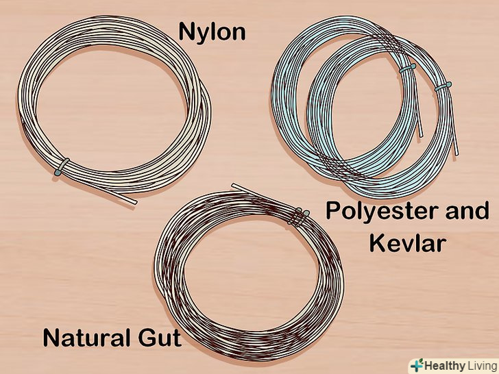 Використовуйте різні струни. поекспериментуйте з різними марками струн, поки не знайдете міцні струни з хорошою пружністю. Більшість тенісних струн робляться з міцного синтетичного волокна, кевлара. Zyex, завдяки своїй хорошій пружинистості, також використовується для струн тенісної ракетки. Також доступні і наступні матеріали:- Нейлонові струни - найдешевші і найпопулярніші струни завдяки своїй гнучкості і дзвінкому удару.