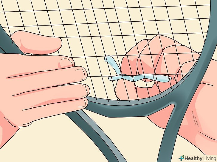 Зав'яжіть поперечні струни. протягніть останню поперечну струну назад в кільце і міцно прив'яжіть до основної струни. Прив'язуйте за допомогою тонких щипчиків. Послабте напругу на струнах і обріжте зайву струну. Потім зніміть ракетку з кріплення.