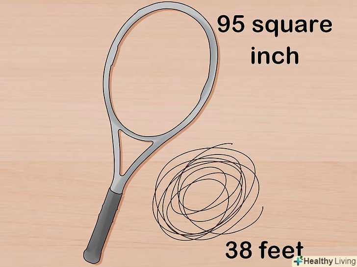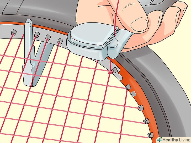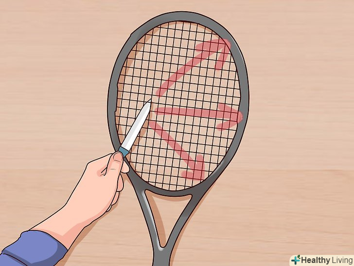 Виміряйте струни. почніть з того, що відріжте від котушки 10-12 см нової струни. Щоб натягнути струни на стандартній ракетці площею 237 квадратних сантиметрів зі стандартним перетином вам, швидше за все, знадобиться близько 11 метрів. Зазвичай краще відрізати більше струни і потім викинути зайве, ніж почати натягувати і потім зрозуміти, що струна занадто коротка і потрібно починати спочатку. [1]- Коли ви перший раз перетягнули струни, порахуйте, скільки вам знадобилося струни на всі вузли, і наступного разу відріжте рівно стільки, скільки потрібно. Починайте з занадто довгою струни і потім розрахуйте ідеальну довжину.