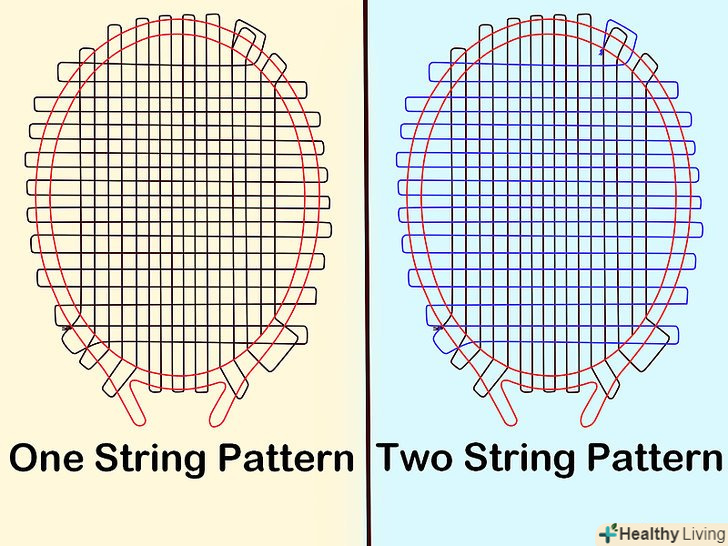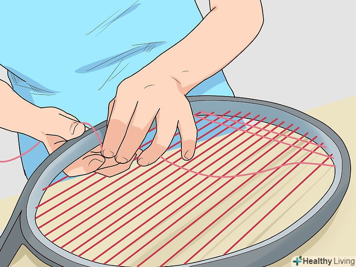 Натягуйте схрещуються струни. коли ви протягнули останню лінію основних вертикальних струн, зав'яжіть її і починайте протягувати поперечні струни. Пересічні струни йдуть паралельно поздовжньої осі ракетки. Вставте струну в отвір, зазвичай кільця збоку побільше, і простягніть поверх основної струни до іншої сторони обідка. Затягніть так само щільно, як ви затягували основні струни і закріпіть першу струну. Продовжуйте протягувати струни, поки не натягнете все. [6]- Якщо ви збираєтеся використовувати дві струни, прив'яжіть поперечну струну до основної у голови і потім протягніть її назад через велике вушко з краю обідка. Зазвичай роблять так.