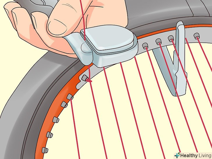 Закріпіть ракетку на верстаті для перетяжки. залежно від верстата, який ви використовуєте, процедура кріплення буде трохи відрізнятися. Закріпіть головку і шию ракетки в спеціальні кріпильні скоби і затисніть Лещата, щоб надійно закріпити ракетку. Відповідно до розпорядження, налаштуйте силу натягу струн. [3]- Система кріплення з шістьма точками рівномірно розподіляє натяг по всій ракетці, але при цьому, який би верстат ви не використовували, вам потрібно перевірити, щоб всі затискачі були надійно закріплені на ракетці. Вони повинні бути досить тугими, щоб не з'їжджати, коли ви махаєте рукояткою, але і не настільки тугими, щоб зігнути обід ракетки.