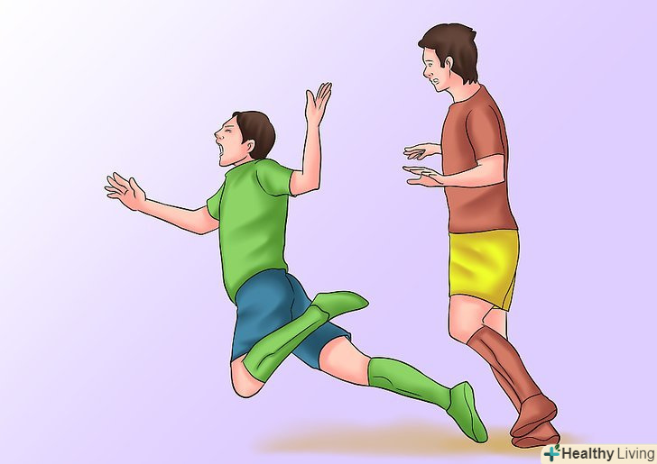 Падайте, коли хтось грубо обриває ваш дриблінг. найкращий час зіграти травму-коли у вас м'яч і захист жорстко пресингує. Навіть, якщо вони заберуть м'яч чисто, викинете ноги назад, немов захист врубалася в ваші гомілки. Падайте, коли хтось грубо обриває ваш дриблінг. найкращий час зіграти травму-коли у вас м'яч і захист жорстко пресингує. Навіть, якщо вони заберуть м'яч чисто, викинете ноги назад, немов захист врубалася в ваші гомілки.- Дайте імпульсу вашого супротивника вплинути на силу, з якою ви викидаєте ноги. Буде найкраще, якщо інший гравець біжить дуже швидко, так симуляція не викличе сорому. Противнику обов'язково потрібно бігти швидко, щоб викидання ніг виглядало реалістично.