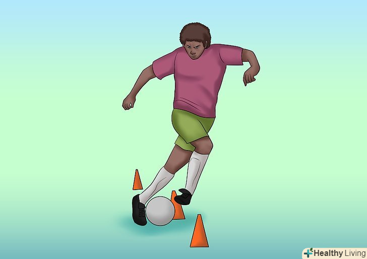 Робота над дриблінгом обома ногами. ніщо не робить гравця більш одноманітним, як постійні проходи в одному і тому ж напрямку. Стати двостороннім дриблером-відмінний спосіб перехитрити суперників. Якщо ви можете бути сильним як з лівого, так і з правого свого боку, ви можете стати домінуючим на полі гравцем і заволодієте відмінною технікою. [1] Робота над дриблінгом обома ногами. ніщо не робить гравця більш одноманітним, як постійні проходи в одному і тому ж напрямку. Стати двостороннім дриблером-відмінний спосіб перехитрити суперників. Якщо ви можете бути сильним як з лівого, так і з правого свого боку, ви можете стати домінуючим на полі гравцем і заволодієте відмінною технікою. [1]- Виконуйте вправи з конусами обома ногами, в одну сторону однією ногою, в зворотну — інший.