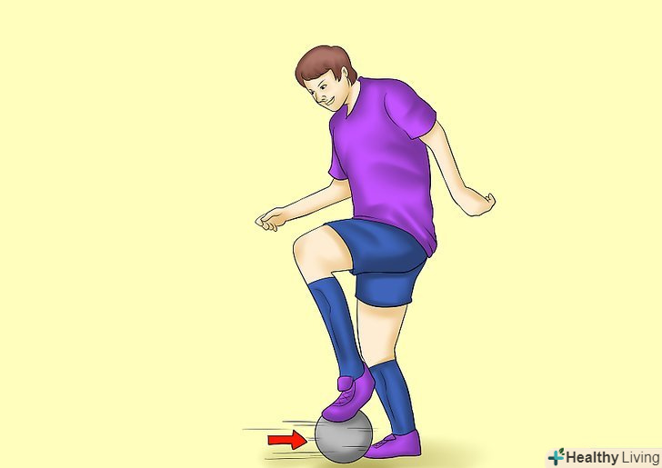 Виконання переступання. можливо, самий блискучий рух в арсеналі дриблера — переступання через м'яч, в якому ви робите рух в одну сторону, перш ніж рвонути в іншу. Для виконання цього руху, ведіть м'яч вперед в звичайному темпі. Виконання переступання. можливо, самий блискучий рух в арсеналі дриблера — переступання через м'яч, в якому ви робите рух в одну сторону, перш ніж рвонути в іншу. Для виконання цього руху, ведіть м'яч вперед в звичайному темпі.- Провідною ногою переступите через м'яч зі слабкої сторони на сильну. Іншими словами, якщо ви правша, переступите через рухомий м'яч зліва направо. Зіпріться на Вашу провідну ногу і використовуйте зовнішню сторону іншої ноги для швидкого переведення м'яча в іншу сторону. Цей рух повинен обдурити суперника, змусивши його втратити напрямок вашого руху, в той час, як ви підете в інший бік.