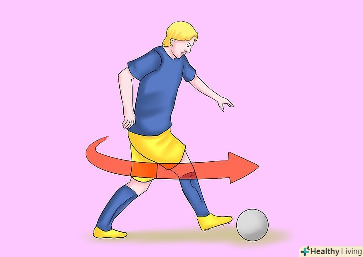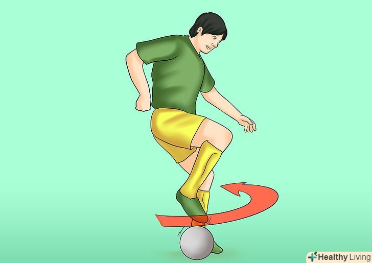 - Ведучи м'яч на зручній для вас швидкості, наступите на м'яч провідною ногою, щоб зупинити його і розгорніть тіло на 180 градусів. Якщо ви наступаєте на м'яч правою ногою, то розвертайтеся через ліве плече, поки не побачите те, що було ззаду.