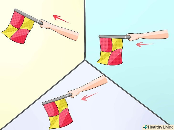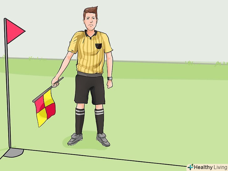 Вихід м'яча за межі поля і відновлення гри. одним з двох головних завдань асистента арбітра є повідомляти про те, що м'яч покинув межі поля, а також про те, як продовжити гру. Після свистка головного арбітра бічний суддя повідомляє, що слід робити далі: Вихід м'яча за межі поля і відновлення гри. одним з двох головних завдань асистента арбітра є повідомляти про те, що м'яч покинув межі поля, а також про те, як продовжити гру. Після свистка головного арбітра бічний суддя повідомляє, що слід робити далі:- Якщо помічник піднімає прапор під кутом 45 градусів і направляє його по горизонталі уздовж бічної лінії, то він вказує про необхідність вкидання ауту. Вкидає м'яч та команда, напрямок атаки якої збігається з напрямком прапора.