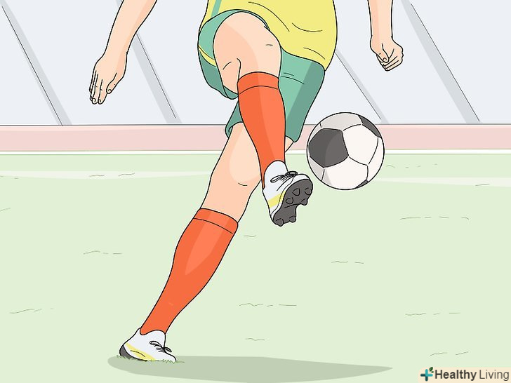 Винесіть ногу вперед у напрямку до м'яча. утримуйте при цьому носок у витягнутому положенні. Безпосередньо перед контактом з м'ячем випряміть ногу для нанесення максимально потужного удару. Винесіть ногу вперед у напрямку до м'яча. утримуйте при цьому носок у витягнутому положенні. Безпосередньо перед контактом з м'ячем випряміть ногу для нанесення максимально потужного удару.