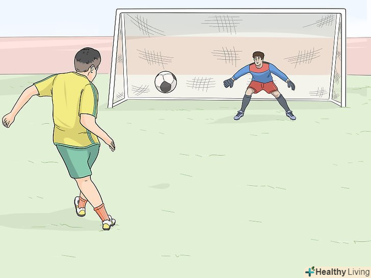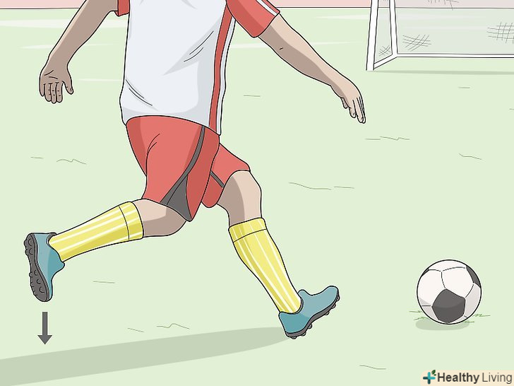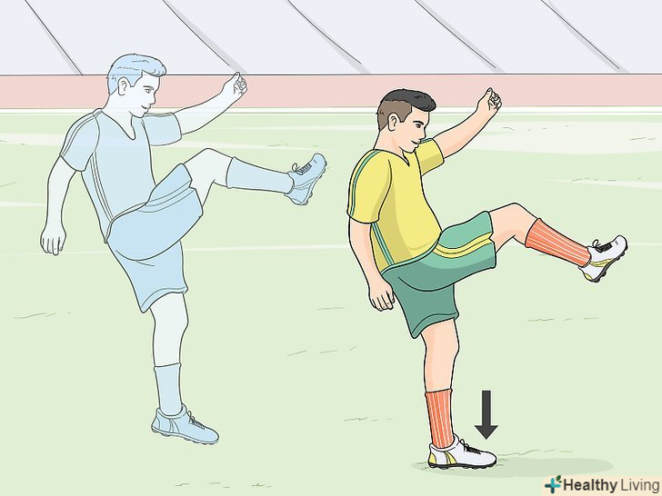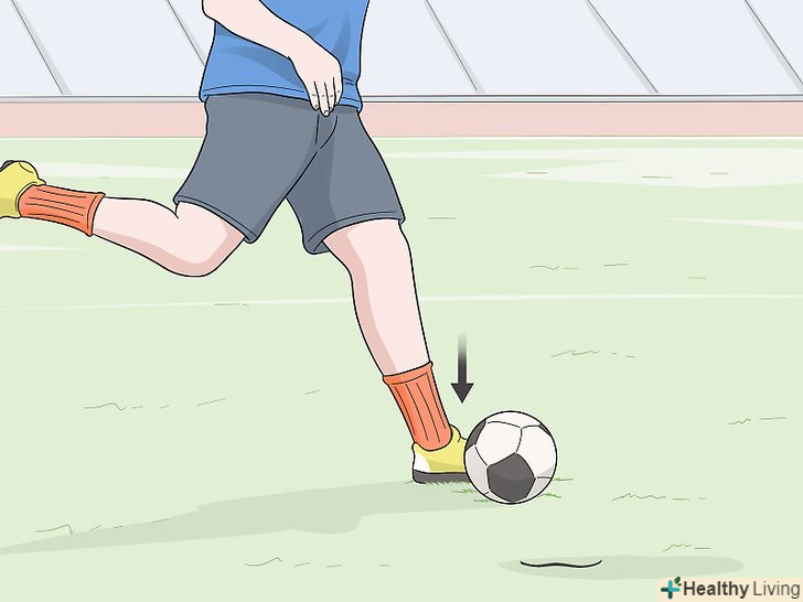 Приземліться на опорну ногу поруч з м'ячем. в кінці розбігу безпосередньо перед ударом опорна нога повинна опинитися біля м'яча, а не за ним. За рахунок цього ваше тіло опиниться над м'ячем. Якщо ж тіло буде знаходитися за м'ячем, то м'яч може полетіти повз цілі. До того ж, ви можете вдарити по ньому носком стопи. [2] Приземліться на опорну ногу поруч з м'ячем. в кінці розбігу безпосередньо перед ударом опорна нога повинна опинитися біля м'яча, а не за ним. За рахунок цього ваше тіло опиниться над м'ячем. Якщо ж тіло буде знаходитися за м'ячем, то м'яч може полетіти повз цілі. До того ж, ви можете вдарити по ньому носком стопи. [2]