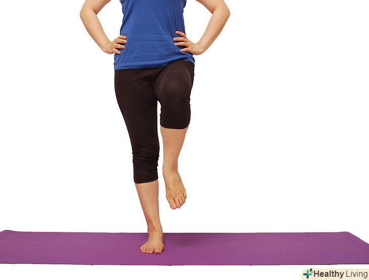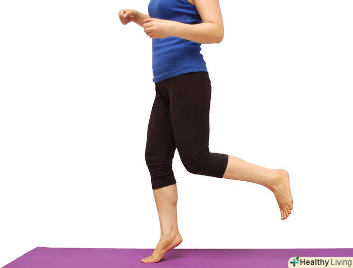 Робіть підйоми коліна. Встаньте, руки з боків, спина пряма. Поставте руки на стегна і підніміть праве коліно, не змінюючи стійки. Опустіть праве коліно, і тепер підніміть ліве.- Поперемінно піднімайте то праве, то ліве коліно 10 разів кожне. Потім відпочиньте і зробіть ще два підходи.