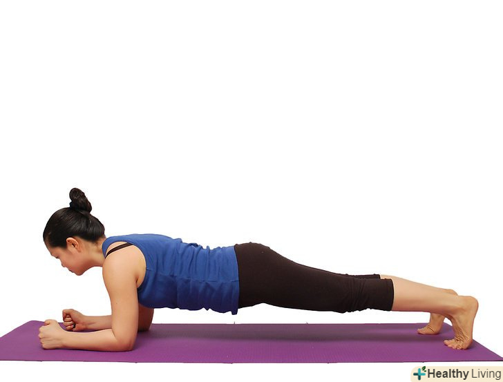 Робіть стійку на зігнутих ліктях. ляжте на живіт, лікті на лінії з плечима. Піднімайте себе на пальцях ніг і передпліччях. Скорочуйте м'язи преса і контролюйте, щоб спина залишалася прямою. Потримайте цю позу хоча б 5 секунд – ідеально, якщо ви будете в змозі тримати її 90 секунд без відпочинку.- Додаткове випробування: опустіть одне стегно на підлогу. Потримайте трохи, а потім поверніться у вихідну позицію. Повторіть з іншим стегном. Це також можна робити з гімнастичним кулею-покладіть кулю під ступні перед тим, як зайняти позицію. Після цього, використовуйте контрольовані рухи, щоб утримати кулю на місці під ногами.