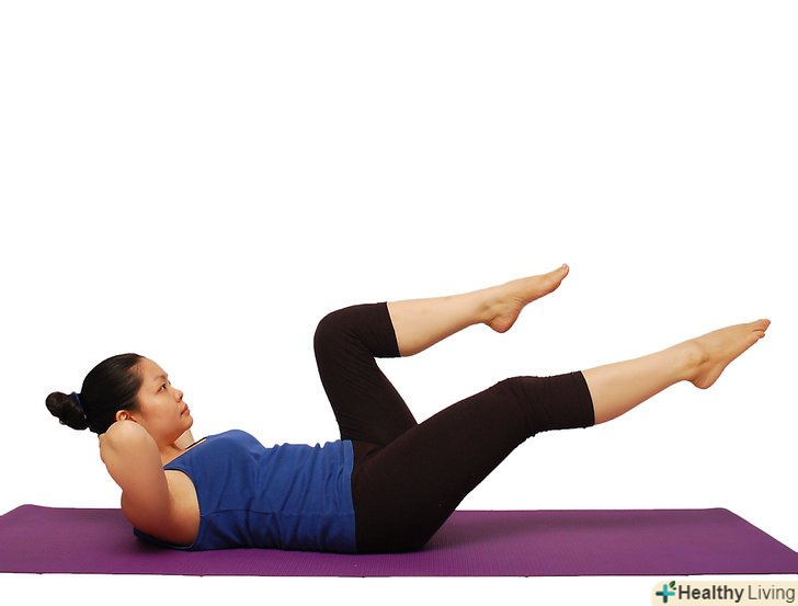 Робіть велосипедик. ляжте на спину і зігніть коліна під кутом 90 градусів. Руки за голову. Підніміть верхню частину спини над землею. Витягніть ліву ногу, праве коліно перед грудьми. Тримайте руки в тому ж положенні, а верхню частину спини так само в повітрі.- Повертайте корпус з кожним рухом. Переконайтеся, що контролюєте кожен рух-ви не хочете рухати стегнами.