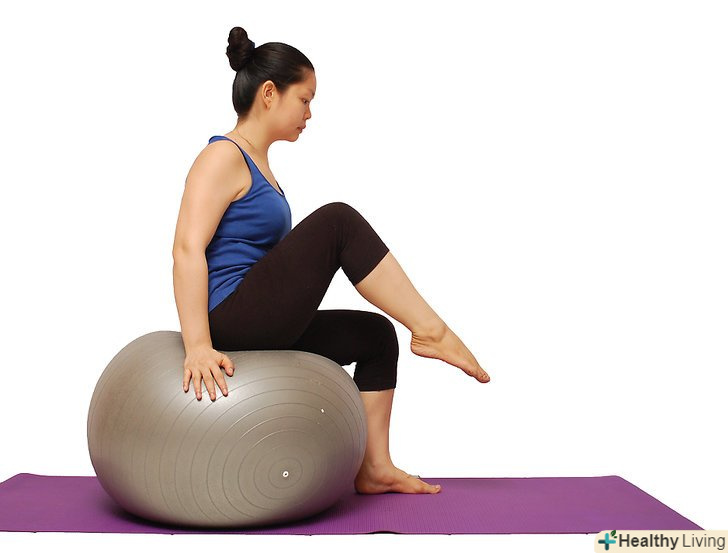Тренуйте згинання коліна на гімнастичному кулі. Сядьте на кулю, ноги перед собою, ступні всією підошвою стосуються підлоги. Покладіть руки на кулю для підтримки. Потім стегнами трохи відхиліться назад (саме стегнами, а не верхньою частиною спини). У той же час підніміть і випряміть праву ногу. Тягніть коліно вгору і до грудей, одночасно з цим, опускаючи торс вперед від стегон.- Робіть те ж саме в зворотному порядку, щоб повернутися в початкове положення. Повторіть лівою ногою.
