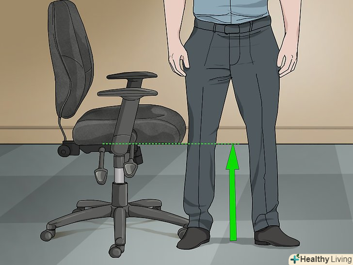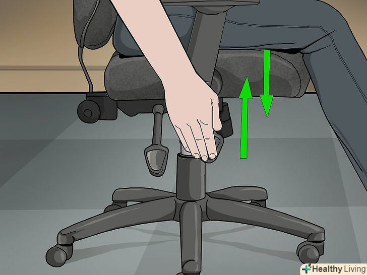 Спробуйте відрегулювати висоту крісла стоячи, якщо у вас не виходить зробити це належним чином з положення сидячи в кріслі. піднімайте або опускайте сидіння до тих пір, поки його край не виявиться рівно під вашої колінної чашкою. Тепер вам буде зручно сидіти в кріслі з рівно стоять на підлозі ногами. [2]
