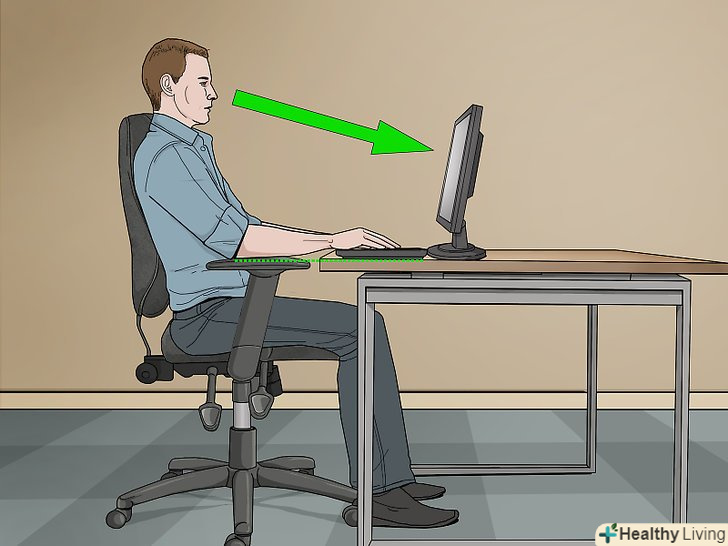 Коли ви працюєте за комп'ютером, очі повинні розташовуватися на рівні монітора. в ідеалі монітор повинен знаходитися трохи нижче рівня очей, а клавіатура – на рівні ліктів. Якщо у вас немає можливості підняти або опустити монітор, можна відрегулювати висоту офісного крісла, щоб пристосуватися. [3]