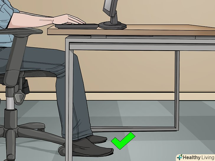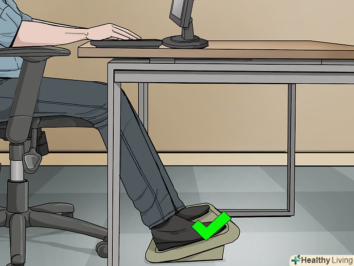 Придбайте підставку для ніг, якщо ваше крісло занадто високе. можливо, вам не вдасться достатнім чином опустити крісло, щоб ноги стояли рівно на підлозі, а руки залишалися на комфортному для роботи рівні. В такому випадку поставте під стіл офісну підставку для ніг і зіпріться ногами на неї. [6]- Підставки для ніг можна знайти в магазинах офісних товарів, і їх висота також буває регульованою.
