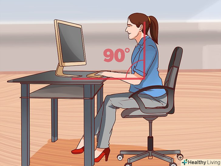 Визначте кут, під яким зігнуті лікті щодо робочого місця. Сядьте настільки близько до столу, наскільки комфортно. Ваші плечі повинні знаходитися паралельно хребту. Покладіть руки на робочу поверхню столу або клавіатуру – те, що ви використовуєте частіше. Кут між плечем і передпліччям повинен становити 90 градусів.- Сядьте на крісло перед робочим місцем якомога ближче і відрегулюйте висоту за допомогою важеля, який зазвичай розташований під сидінням зліва.