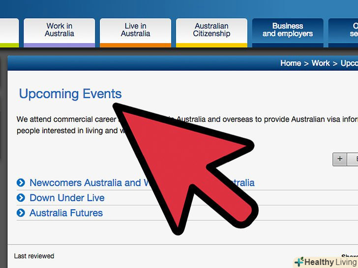 Приділіть увагу заходу"необхідні професії". Австралійський уряд шукає вузькоспеціалізованих працівників, таких, як зі списку професій (SOL). Поїдьте на один з таких заходів, щоб знайти собі роботу. Для цього вам потрібно поїхати в Англію або іншу країну, щоб взяти участь у виставці вакансій.- Відвідайте сторінку www.immi.gov.au/skillevents/upcoming-events.htm, щоб знайти розклад таких заходів.