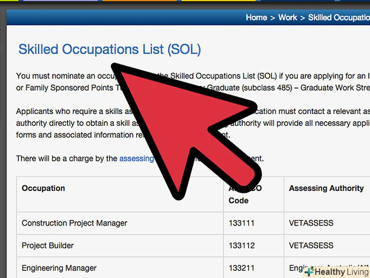 Перегляньте список професій (SOL). якщо ви кваліфікований працівник в одній із зазначених там галузей, у вас значно більше шансів отримати спонсоровану або незалежну робочу візу. Медичні, інженерні та комп'ютерні професії ― Основні в цьому документі.- Відвідайте сторінку www.immi.gov.au/skilled/_pdf/sol-schedule1.pdf, щоб знайти оновлений Список професій.