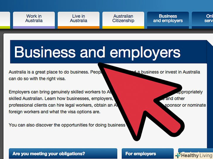 Подайте заявку на отримання бізнес-візи в Австралію. є кілька типів бізнес-віз, зазвичай вони видаються підприємцям або інвесторам, які хочуть розвивати австралійську економіку. Ви також можете отримати візу для проходження тренінгу або ведення бізнесу на короткий період часу.- Якщо ви плануєте ділову поїздку, вам потрібен дозвіл на тимчасове безвізове перебування або eVisitor Віза перед тим, як отримаєте візу підкласів 956, 977 of 651. Відвідайте сторінку www.immi.gov.au/skilled/business/business-visit-visa-options.htm щоб дізнатися, як подати заяву.