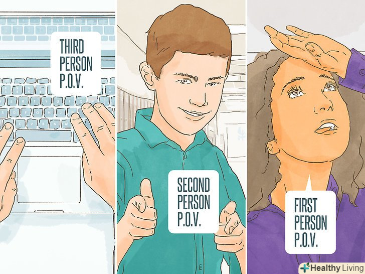 Виберіть, від якої особи описувати події сюжету. всього можливо три варіанти: від першого (займенник «я»), другого (займенники «ти») і третьої особи (займенники «він», «вона» і «вони»). Даний вибір вплине на форму розповіді.[9]- Ви хочете розповісти історію з точки зору головного героя? В такому випадку ви обмежені варіантами від першої особи або третьої особи (займенники «він», «вона» і «вони» дозволять висловити думки персонажа).