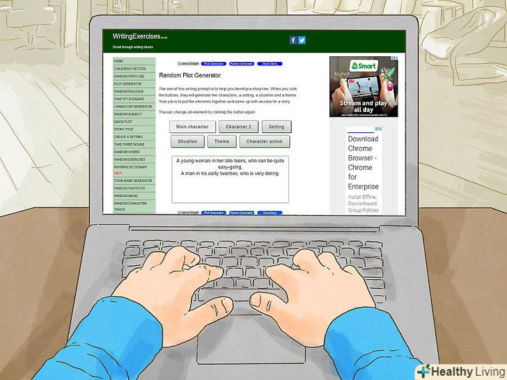 Використовуйте генератор сюжетів.Генератори сюжетів допомагають відразу почати сюжет завдяки незвичайним, винахідливим або несподіваним припущенням. Іноді достатньо підказки ззовні, щоб запалити іскру уяви!- Для різноманітних сюжетів можна використовуватиhttp://http://litgenerator.ru