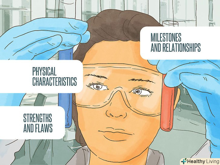 СтворітьХарактеристики кожного важливого персонажа.також можна написати менш докладні характеристики другорядних персонажів. Навіть якщо частина інформації про персонажа ніколи не відіб'ється в сюжеті, такі відомості допоможуть автору отримати всебічне уявлення про героя і зробити свою розповідь більш глибоким! В інтернеті можна знайти різні характеристики і схеми створення персонажів, але обов'язково вкажіть основні відомості про героя:[7]- Зріст, вага, расова приналежність, колір очей, волосся і шкіри, стан здоров'я;