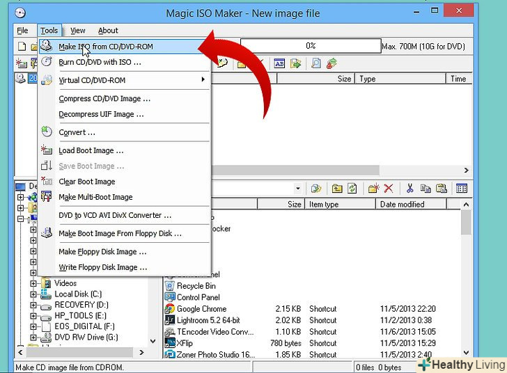 Вставте диск в дисковод після установки програмного забезпечення.відкрийте MagicISO і виберіть меню " Tools "і натисніть"Make ISO from CD/DVD-ROM". Виберіть вихідний диск (він повинен автоматично вибиратися для вас), вирішите, як ви хочете назвати файл і де ви хочете зберегти його, завершіть операцію. Це повинно зайняти близько 15-20 хвилин.
