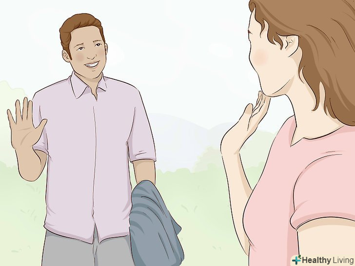 Привітайте свою подругу і посміхніться їй при зустрічі. коли ви тільки помітите свою подругу біля кінотеатру, подивіться їй в очі і посміхніться. Скажіть "Привіт". Розслабтеся і поверніться обличчям до подруги. [4]- Обійміться або поцілуйте подругу в щоку тільки в тому випадку, якщо ви впевнені, що це буде доречно. Згадайте, віталися ви таким чином раніше, а також подумайте, як ця дівчина відноситься до вираження почуттів на публіці.
