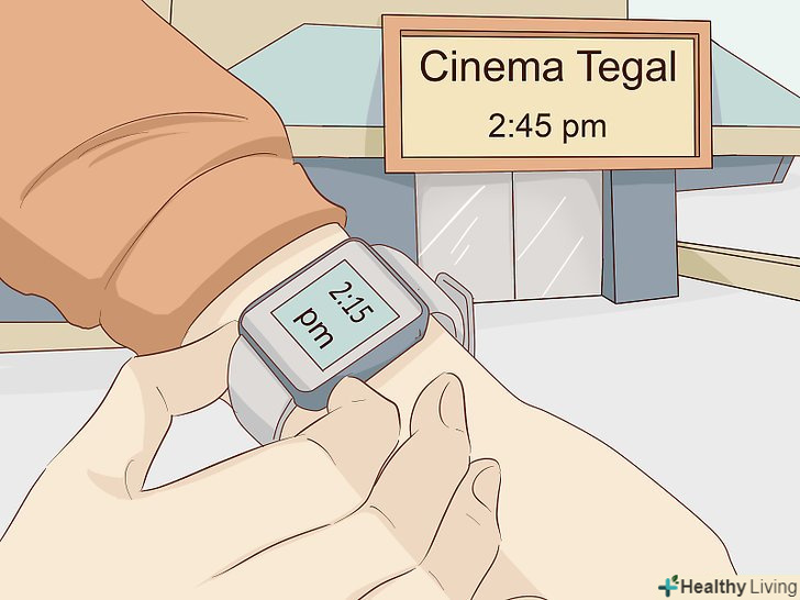 Постарайтеся раніше прийти в кінотеатр. заплануйте прийти за 5-10 хвилин до початку фільму. Таким чином, вам не доведеться збиратися і вбігати в зал в останню хвилину, і ви будете почувати себе більш спокійно. Можете почекати подругу зовні, а можете зайти в кінотеатр і купити вам обом квитки, якщо хочете.- Ще один варіант — домовитися зустрітися з подругою раніше, щоб був час купити що-небудь перекусити і вибрати хороші місця перед початком фільму. Таким чином, з самого початку побачення ви не будете поспішати і відчувати себе завантаженим.