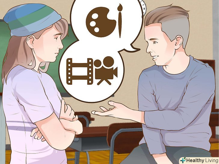 Станьте друзями. знайдіть загальні теми для розмови. Наприклад, скажіть дівчинці, що Ви теж любите малювати. Попросіть її показати свої малюнки і висловіть свою позитивну думку про них. Якщо вам обом подобаються фантастичні фільми, почніть розмову про якийсь фільм. Завдяки цьому ви закладете гарну основу для розвитку відносин. [11] однак ваша розмова не повинна просто зводитися до звичайної балаканини.
