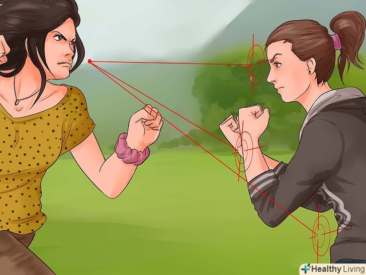 Шукайте слабкі сторони. у той час як вона огризається, зберігайте спокій і подумайте, як можна зачепити її. Якщо вона нижче-накиньтеся на неї зверху вниз. Якщо вона вище-киньтеся їй в ноги або живіт. Якщо у неї довге волосся, схопіть їх і потягніть голову вниз так, щоб їй нічого не було видно. [3]