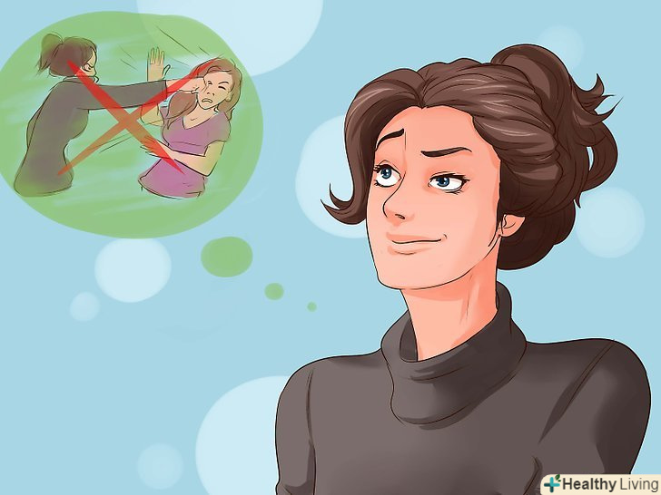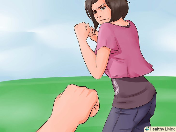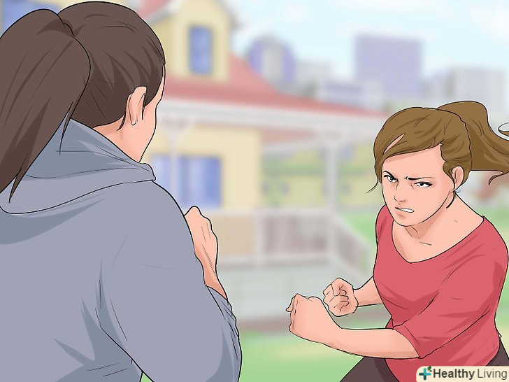 Ніколи не бийте першою! ваше завдання — уникнути бійки, якщо це взагалі можливо. Сперечайтеся з нею або спробуйте переговорити, але, що б ви не робили, просто не будьте тією, хто почне бійку. Якщо ви будете стояти на своєму і не говорити нічого занадто обурливого,можливо, вам взагалі не доведеться битися. [2]- Спробуйте використовувати діалог (розмова), щоб запобігти бійку. Скажіть щось на кшталт: "Анджела, я втомилася від усього цього спору. Це нічого не змінить. Давай краще просто будемо триматися один від одного подалі", - або: "чи дійсно бійка вирішить цю проблему? Впевнена, є більш конструктивний спосіб".