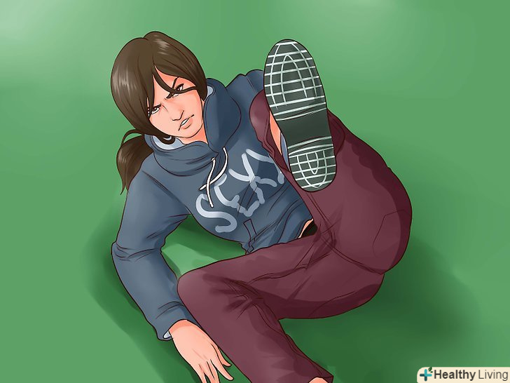 Якщо впадете на землю, бийте ногою. намагайтеся повністю уникнути падінь на землю, але якщо все ж впадете, бийте ногами атакуючого, щоб тримати його подалі від себе. Шукайте можливості встати, але не відвертайтеся від опонента. Якщо це не спрацює, згорніться в клубок, щоб захистити себе. [4]