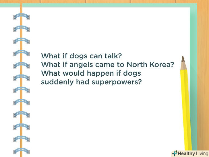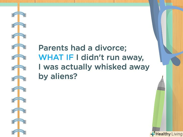 Нехай ваші думки течуть як фільм.якщо у вас є чіткий план, але ви не можете рухатися далі, просто розслабтеся і уявіть те, що написали (або якщо у вас нічого не написано, просто уявіть можливі ідеї). Подумайте про це, як про невеликий фільм у вашій голові; що б ви не уявляли, зрештою, це виллється в слова. Просто мислите творчо і придумуйте різні варіанти кінцівки.