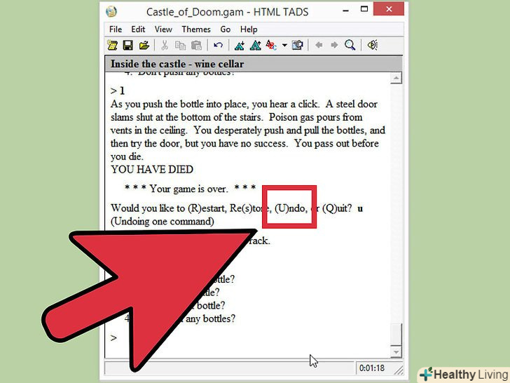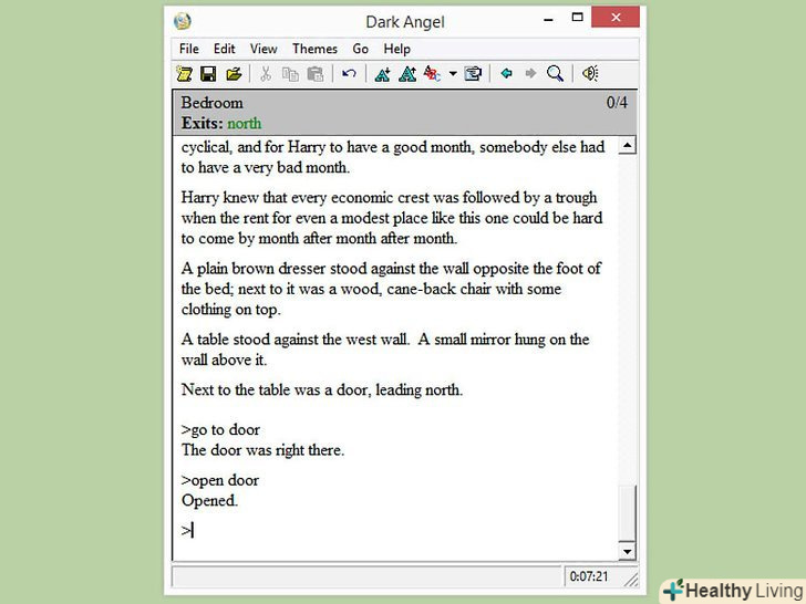 Ознайомтеся з текстовими командами. у більшості текстових ігор для того щоб просунутися далі, необхідно ввести команду. Люди, які грали раніше в інтерактивну белетристику, будуть очікувати від вашої гри наявність певних команд, на кшталт «вивчити (об'єкт)» і «взяти (об'єкт)». [4]- Технічна документація або довідка для обраного програмного забезпечення повинна познайомити вас з цими командами і тим, як додати їх в гру.
