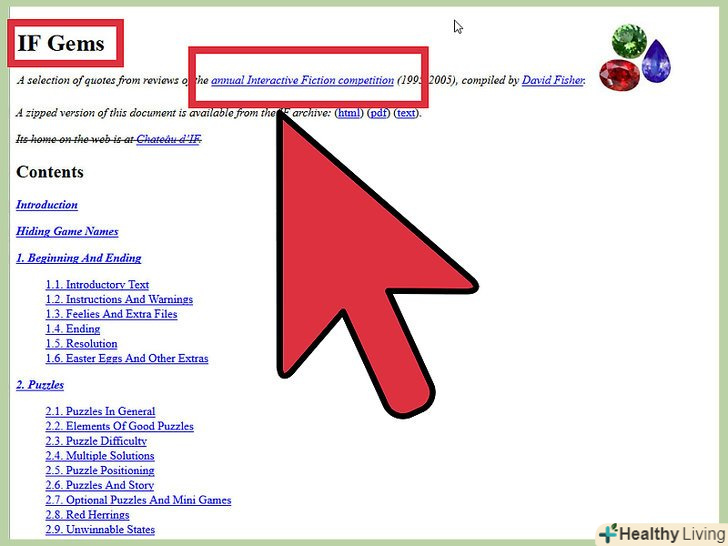 Шукайте поради та натхнення. є десятки, якщо не сотні статей на Brass Lantern , Interactive Fiction Database і IFWiki , де ви зможете відточити свої навички в спеціалізованих темах про те, як створити правдоподібного персонажа або як програмувати об'єкти зі складними взаємозв'язками. Можливо, більш важливою є велика колекція текстових ігор на IF Archive , , де ви зможете знайти вподобані ігри і особисто в них зіграти. Ось кілька сайтів, з яких варто почати:- Колекція цитат на IF Gems collection .