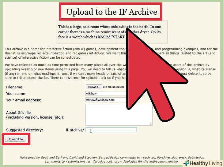 Вихід гри. деякі програми для створення текстових ігор мають онлайн-платформу, на яку Ви можете завантажити гру. Більш поширеним варіантом є завантаження гри на IF Archive і розміщення опису на IFDB .- Для отримання відгуків, викладіть посилання на вашу гру в соціальних мережах і форумах інтерактивної белетристики.